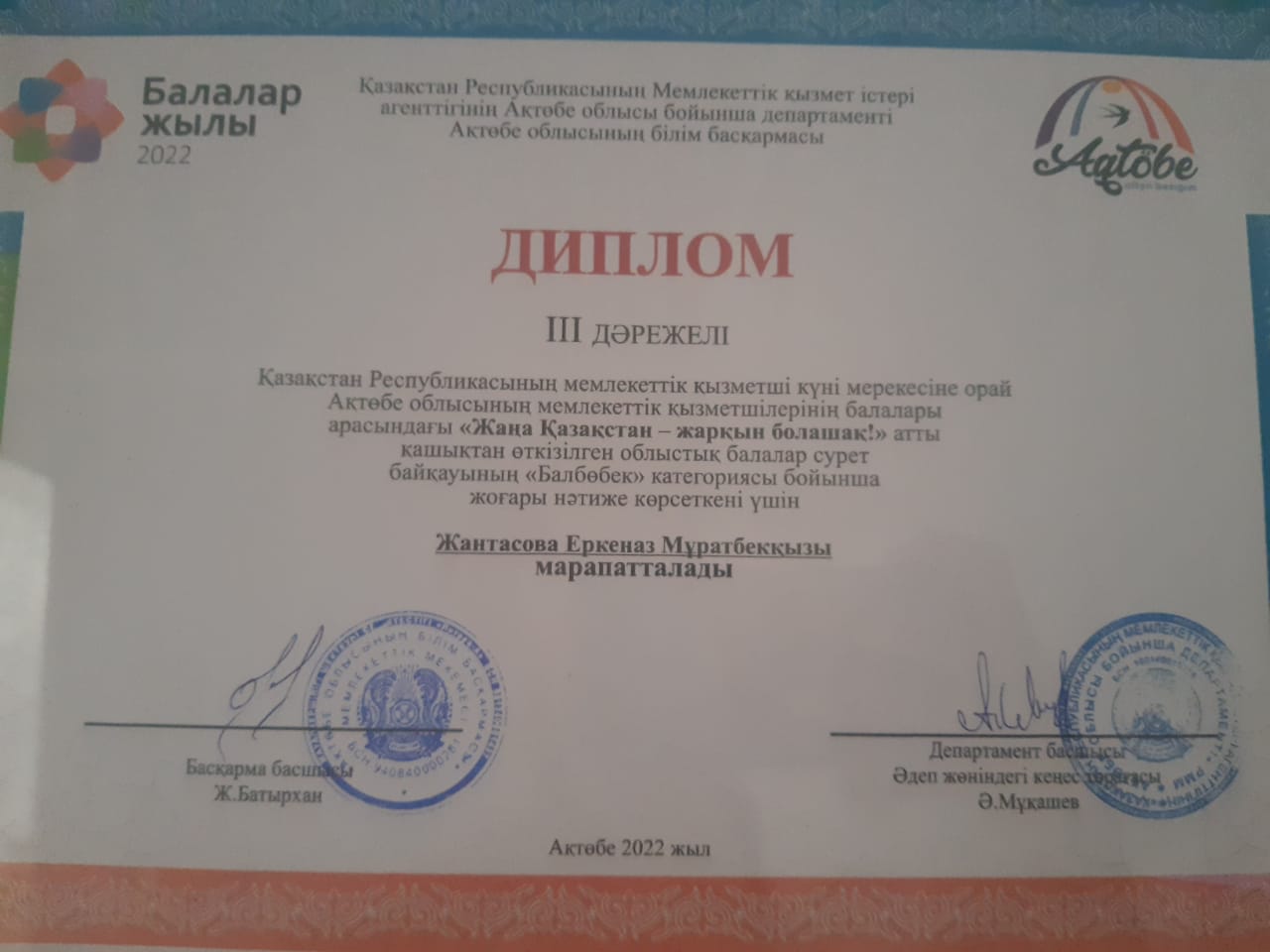 "Балалар жылы" деп жариялауына орай, балалар арасында өткізілген "Жаңа Қазақстан - Жарқын болашақ!" атты облыстық балалар сурет байқауының жеңімпаздары анықталды.Байқауға жалпы саны 200-ге жуық композициялық жүмыстар келіп түсті.Қазылар алқасымен жұмыстар іріктеліп, байқау ережесінің мазмұнына сай жұмыстың орындалу деңгейі, шығармашылықтары ескере отырып,суреттері үздік шыққан 30 бала жеңімпаз болып анықталды.Әйтеке би ауданынан 2 жұмыс марапатталды. Соның бірі "Балдәурен" МДҰ бүлдіршіні Жантасова Еркеназ Мұратбекқызы ІІІ орын ҚҰТТЫҚТАЙМЫЗ!!!